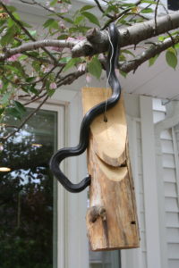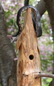 On the first really warm day of spring, I glanced out the kitchen window to take in our magnificent cherry tree, whose branches were heavy with cotton-candy blossoms just beginning to lose their grip and drift across the lawn. I did a double take, wondering how that black hose had gotten wrapped around the birdhouse hanging just outside the glass. To my horror, I realized it was no hose but a 5-foot black rat snake, its head plunged inside the birdhouse, looking for a snack.