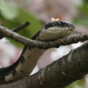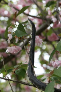 For the next half-hour, I stood under the tree watching the snake wind through the cherry blossoms, its scales at times catching the sunlight, at other times camouflaged along the length of a branch. The muscular beauty of the thing was riveting. At one point a pink petal rested on its head. I have always had a strong aversion to snakes, but that was nothing less than cute. I understood for the first time why Eve was not repulsed.