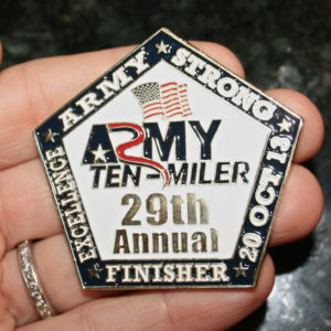 In case you’ve never been to one of these massive races (the Army 10-Miler is the second biggest 10-miler in the United States and the third largest in the world), you might be interested to learn that a huge truck collects all of the clothing dropped along the course for charity distribution after the race. So, having served their pre-race purpose, I was happy to leave my ill-fitting, hot-flash-inducing fuzzy purple jacket and soccer sock warmers draped on a railing near the starting line.