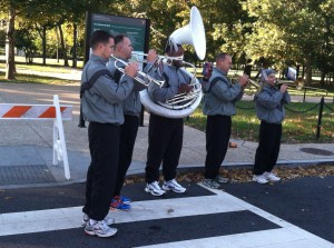 As if all that encouragement wasn’t enough, military and high school bands were posted at intervals along the course, their music recharging our batteries along the way.
