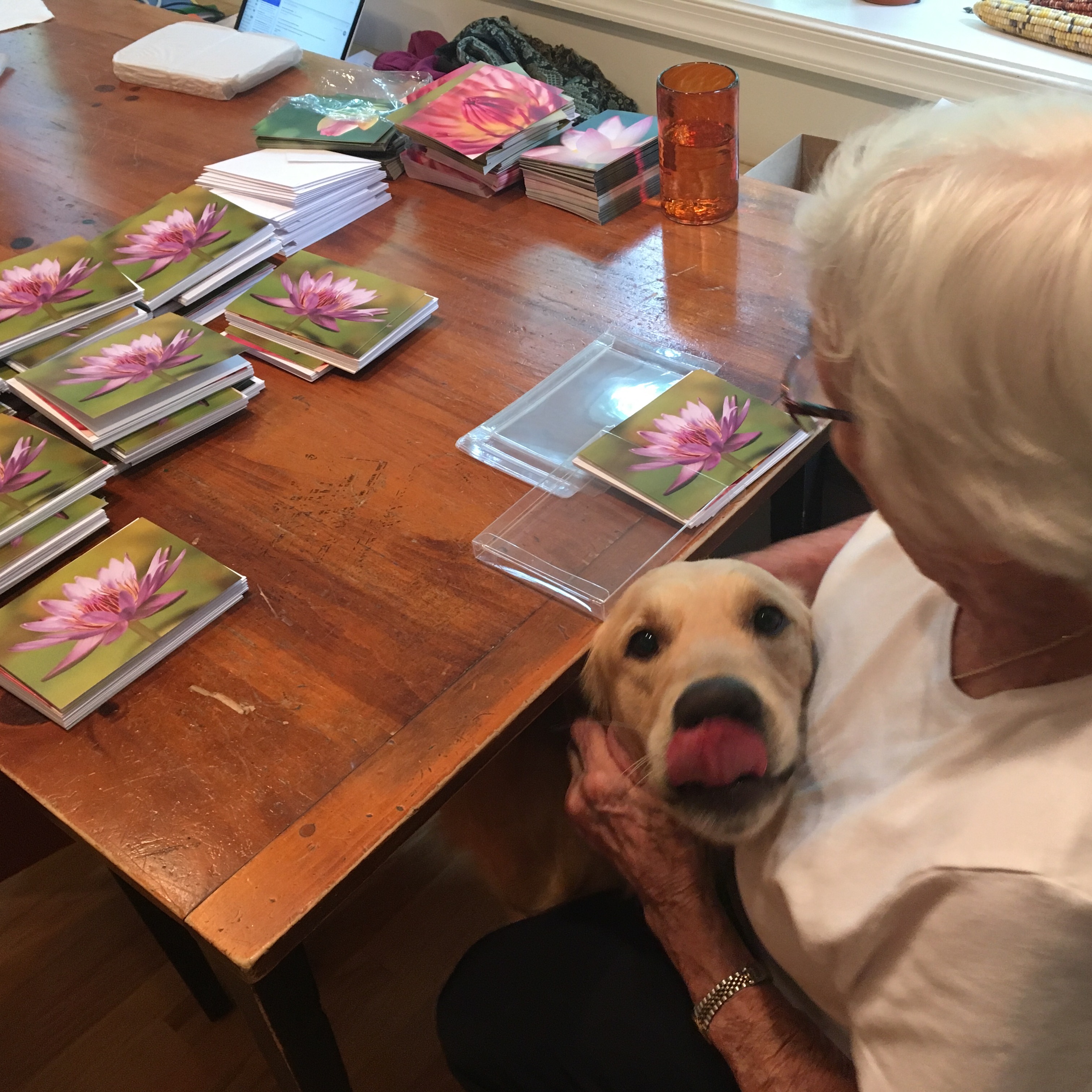 My mom/Grandma Ellen helping me box up notecards — my favorite part of preparing for a show! Apollo helped too. Well, sort of.